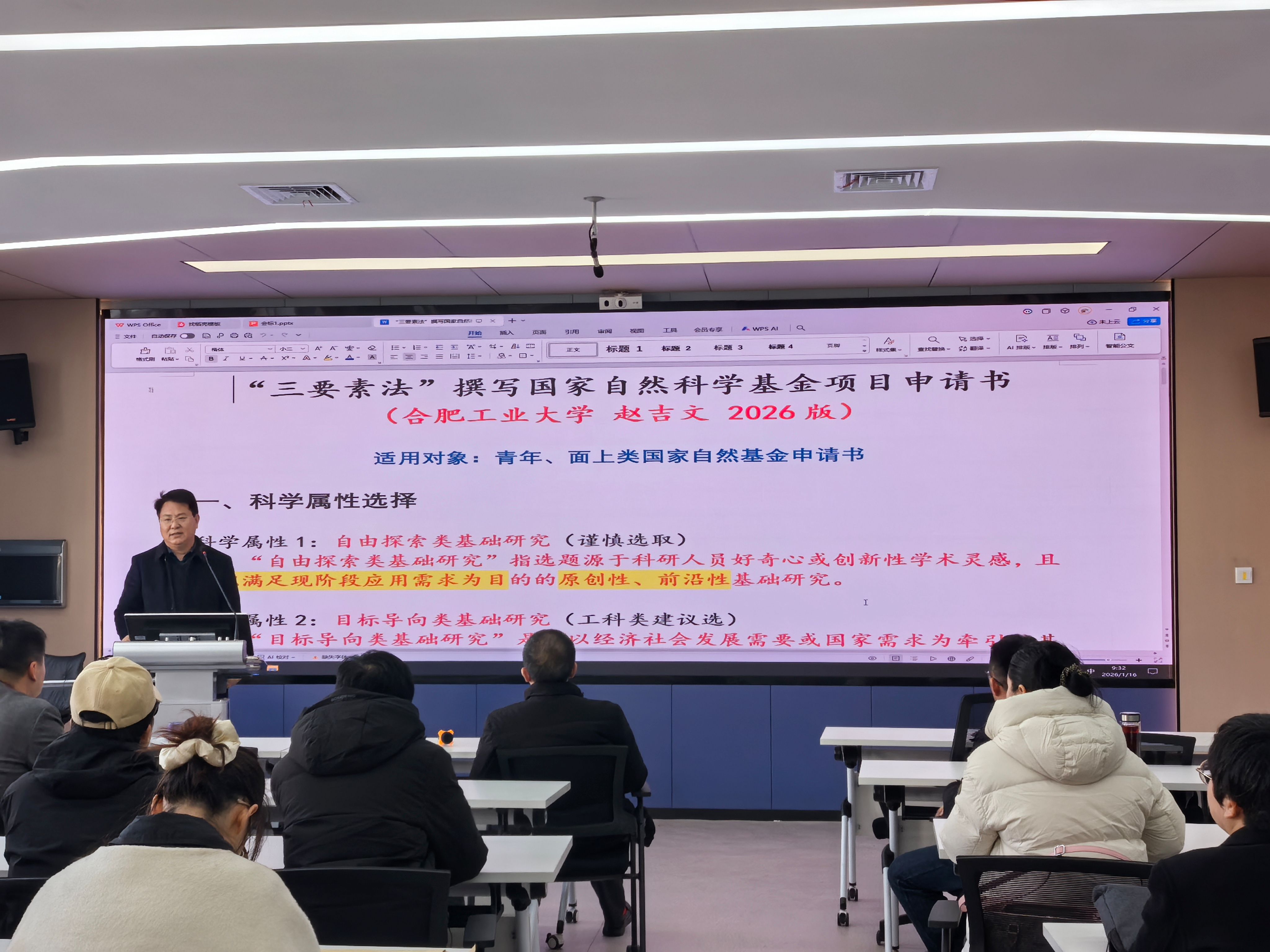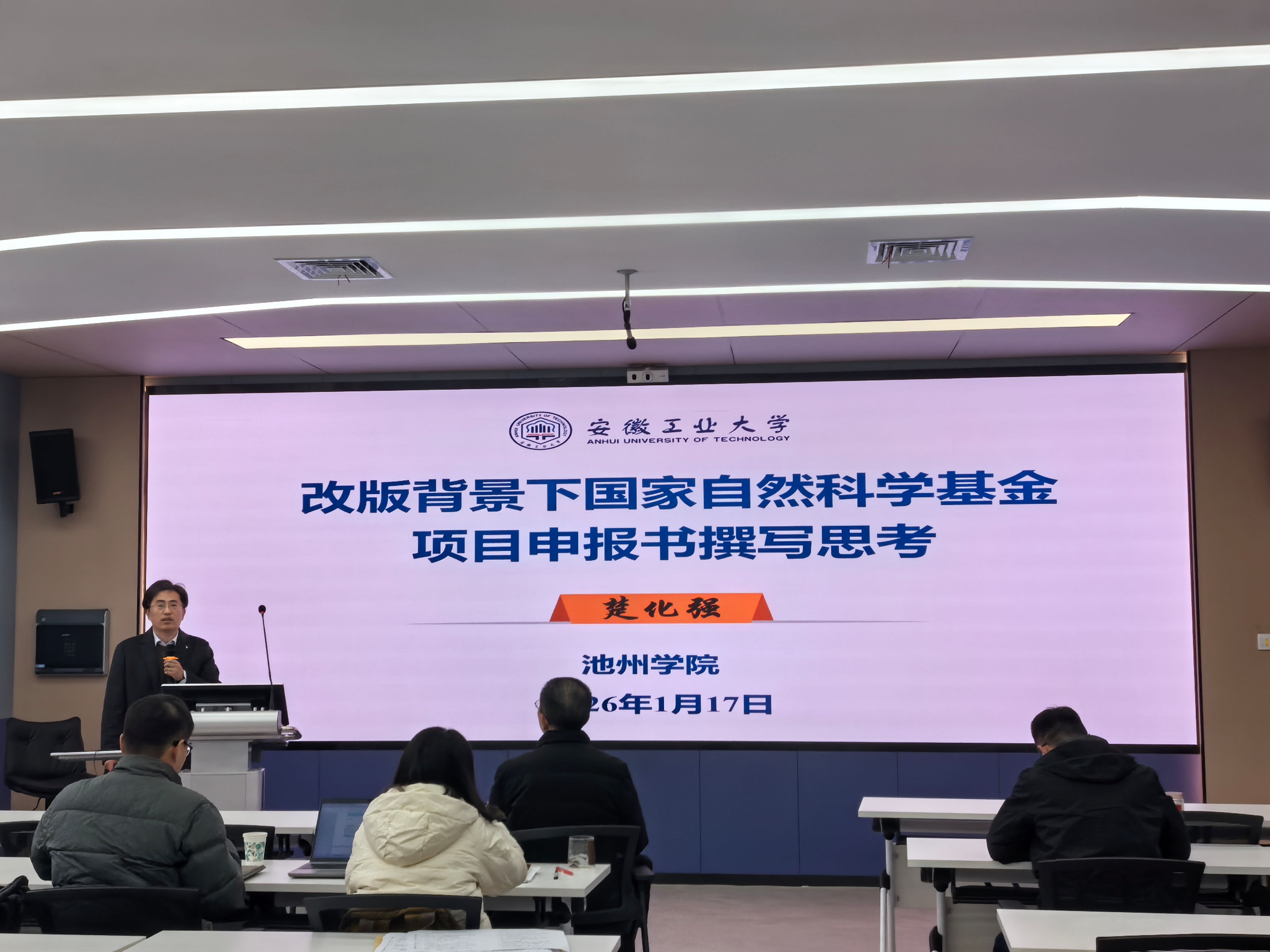 学院特邀校外专家莅临指导,为基金申报工作精准赋能。合肥工业大学赵吉文教授作《三要素法撰写国家自然科学基金项目申请书》专题报告,从核心要素提炼、逻辑框架搭建、内容精准表达等关键维度,为教师拆解基金申报书撰写的底层逻辑与实操技巧。安徽工业大学楚化强教授则以《改版背景下国家自然科学基金项目申报书撰写思考》为题,结合最新申报书改版要求,深入分析政策导向变化,指导教师如何精准契合评审标准、突出申报特色与创新点。两场报告既有方法论的高度提炼,又有实践层面的细致指导,有效破解了教师在基金申报中的痛点难点问题,为学院2026年度国家自然科学基金申报工作指明了优化方向。