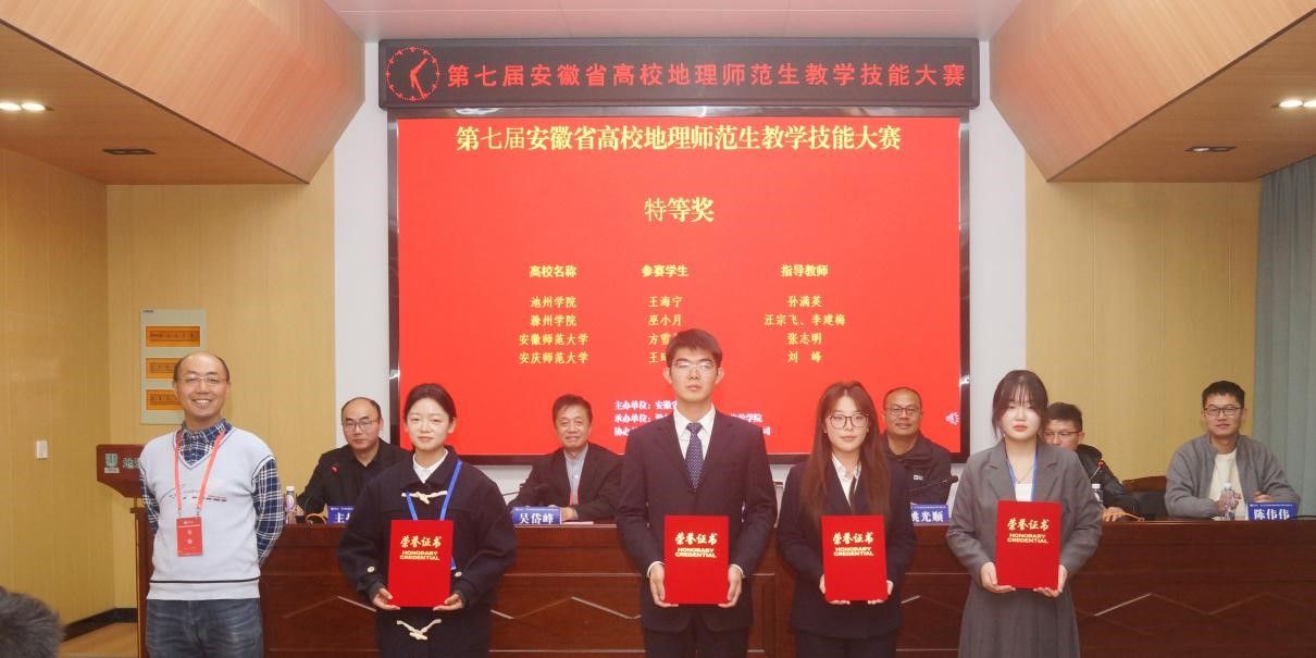 2025年11月14日至15日,第七届安徽省高校地理师范生教学技能大赛在滁州学院顺利举行。来自全省六所高校的地理科学专业学生同台竞技。王海宁、杨佳乐、陈张楠凭借扎实的专业知识、出色的课堂表现和稳定的教学发挥,分别荣获特等奖和二等奖。