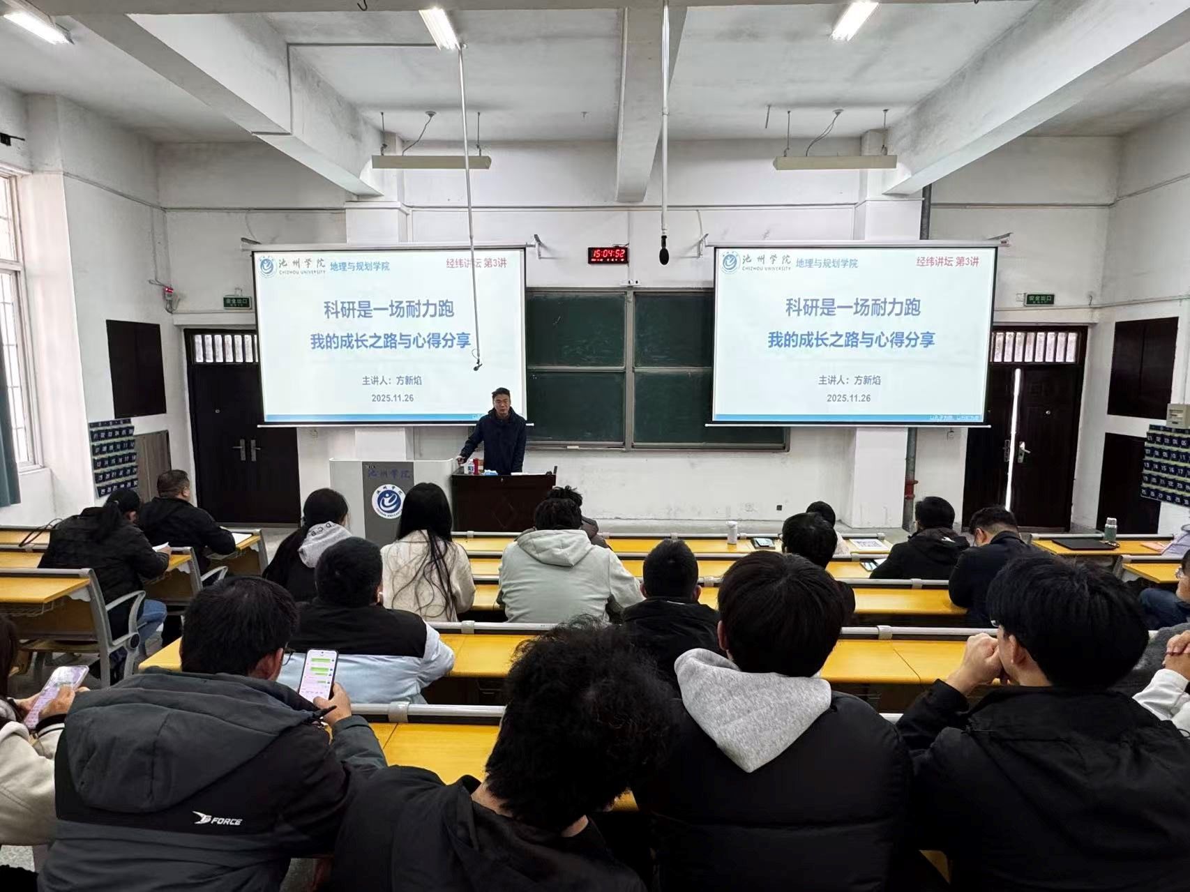 11月26日下午,地理与规划学院“经纬讲堂”系列学术活动第四讲在博文阶101教室成功举行。本次讲座以“科研是一场耐力跑:我的成长之路与心得分享”为主题,邀请学院教工第二支部博士方新焰担任主讲人,教工第二支部书记、地理科学系主任荣慧芳主持活动。学院160余名师生共同参与了本次活动。