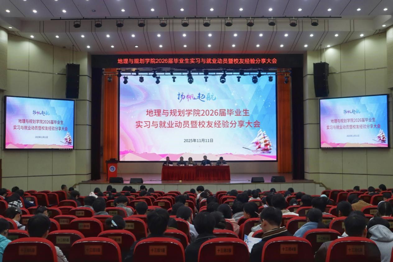 为深入贯彻落实国家关于高校毕业生就业工作的决策部署,进一步完善毕业生实习就业创业服务体系,聚焦2026届毕业生职业发展需求,全力促进2026届毕业生高质量充分就业,地理与规划学院于2025年11月11日下午14:00,在博古楼大礼堂召开了实习与就业动员暨校友经验分享大会。